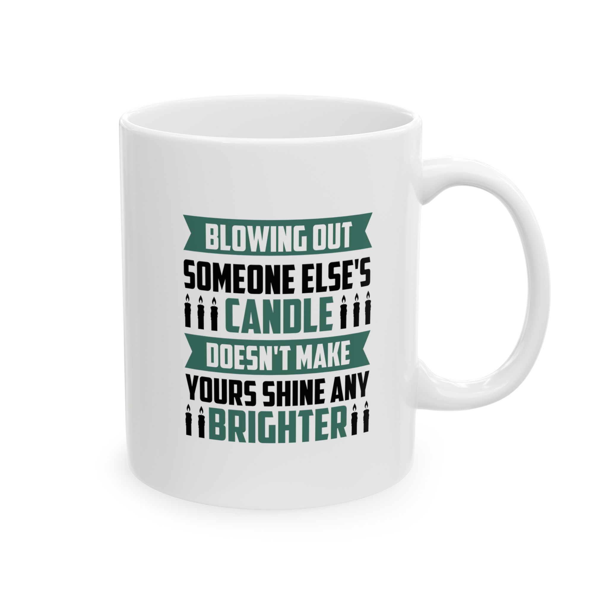 Inspire every sip with the merry&Black ‘Candlelight Wisdom’ mug. This 11-ounce white ceramic mug carries a powerful message: “Blowing out someone else’s candle doesn’t make yours shine any brighter.” The typography is carefully arranged to draw the eye and invite reflection, making it more than just a vessel for your drink—it’s a conversation starter. Perfect for those who value wisdom and positivity in their daily lives, it’s also microwave and dishwasher safe, ensuring the message—and your mug—remains clear and bright use after use. Enjoy your favorite hot beverage with a side of thoughtful contemplation.
